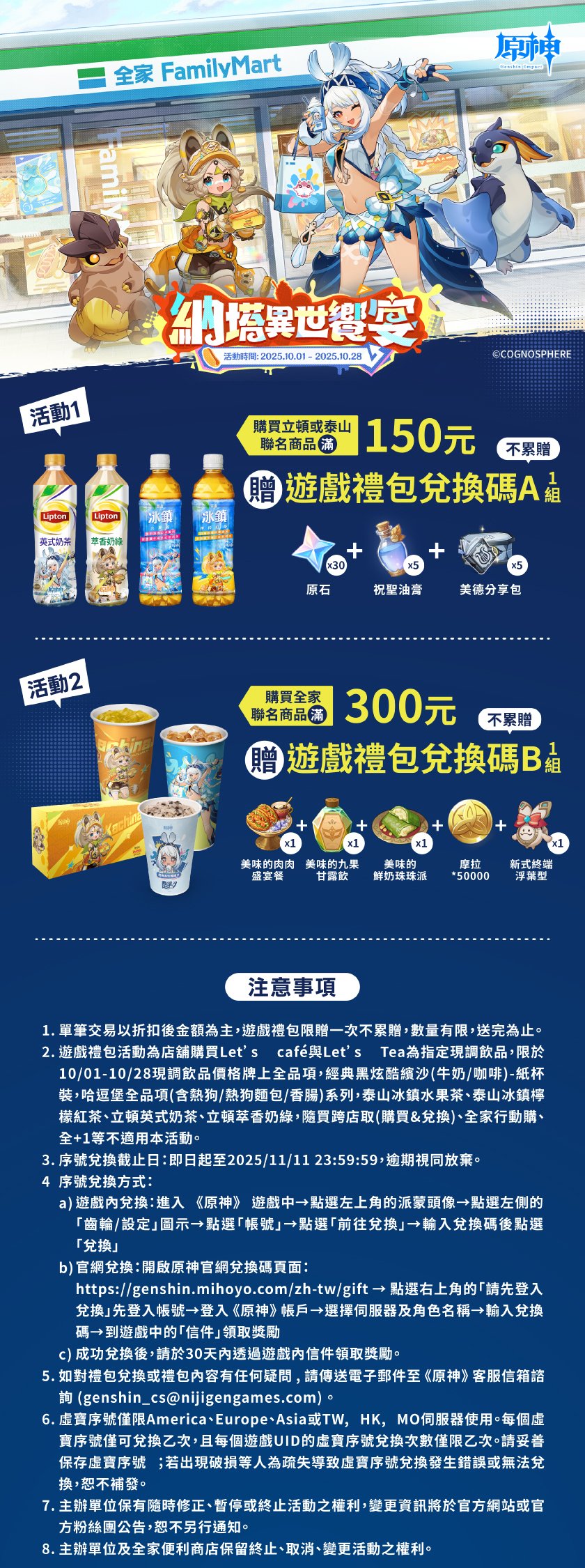 全家便利商店 10/1~10/28 《原神》聯動活動 購買 Let's Café、Let's Tea特大飲品即可獲得聯動包裝