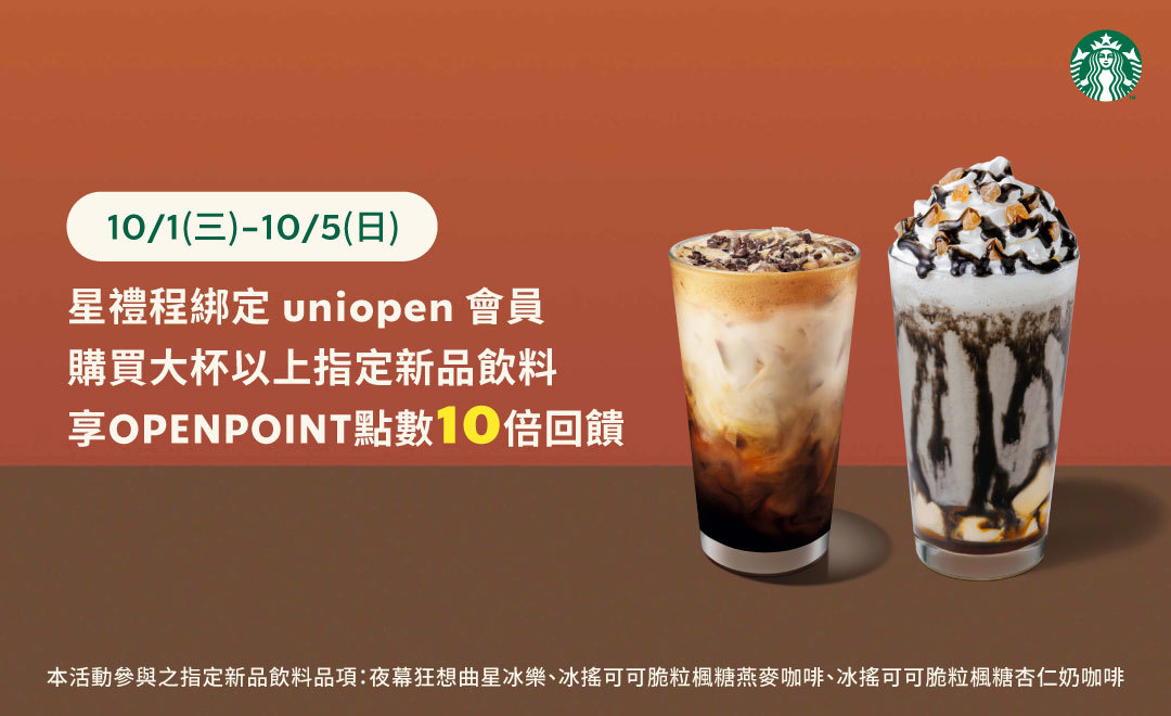 2025/10/1(三)-10/5(日)於星巴克實體門市原價購買大杯以上指定新品飲料, 使用綁定uniopen會員帳號之星巴克APP支付或點餐時主動感應uniopen會員條碼,即享OPENPOINT點數10倍回饋。