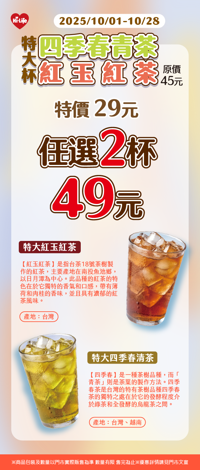 (特大)四季春青茶、紅玉紅茶 特價29元 任2杯49元