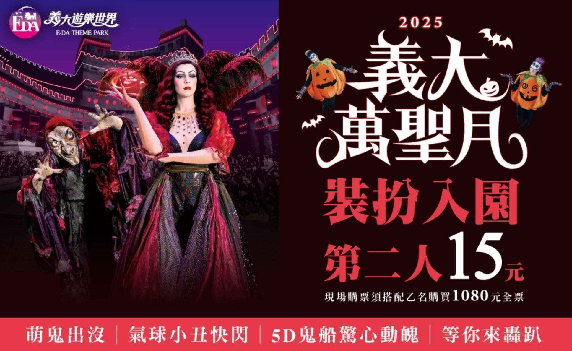 義大遊樂世界 萬聖節指定週末 萬聖裝扮購票入園第二人15元​​​​​​​(需搭配乙名購買1,080元全票)