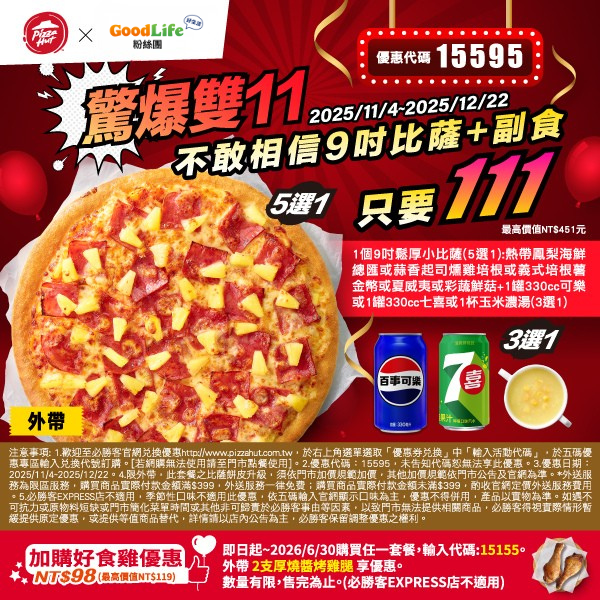 必勝客比薩 驚爆雙11  外帶九吋比薩+ 飲料 只要111