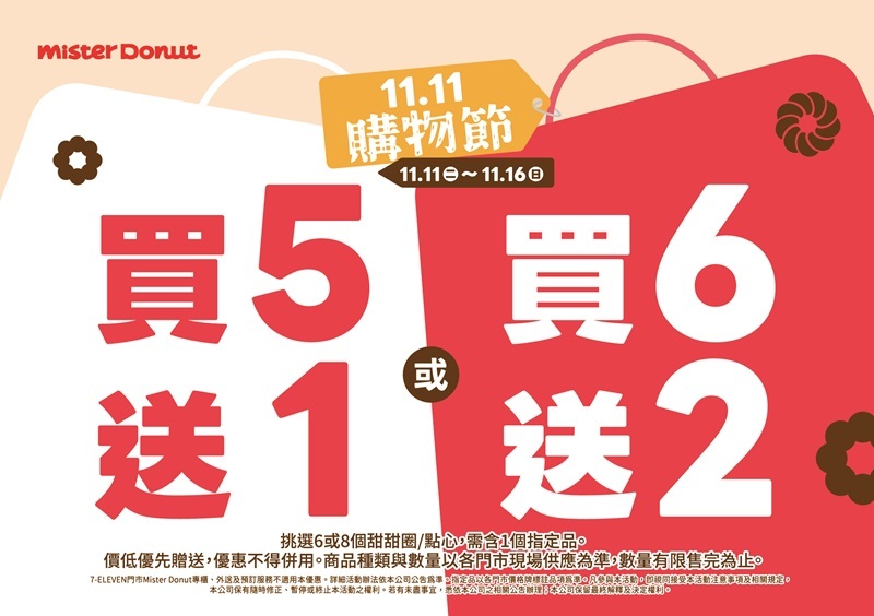 Mister Donut 11/11~11/16 甜甜圈可享買5送1及買6送2優惠