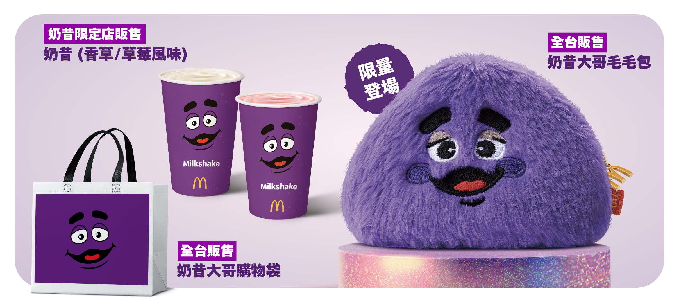 「奶昔大哥毛毛包」與「奶昔大哥購物袋」將自11月19日上午10:30起在全台麥當勞餐廳販售,數量有限,售完為止!
