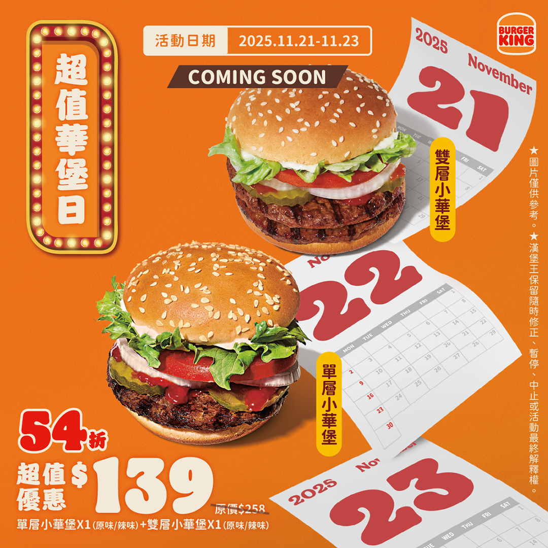 漢堡王 11/21~11/23 華堡日 雙層小華堡+單層小華堡只要139元 (54折)