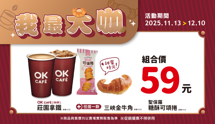 OK超商 11/13~12/10 莊園拿鐵咖啡搭配指定麵包商品59元