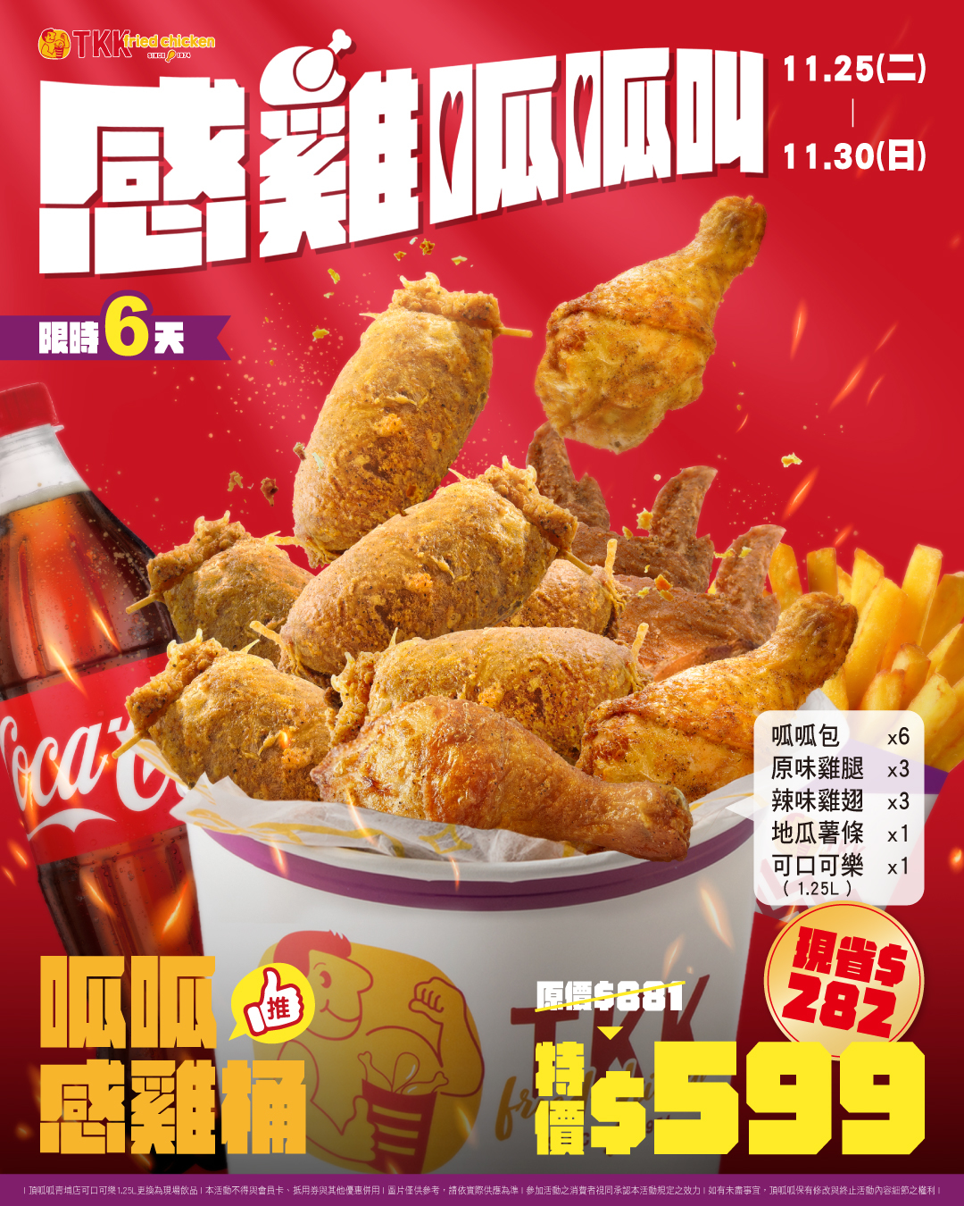 內容物:呱呱包6顆+原味雞腿3隻+辣味雞翅3隻+地瓜薯條1份+可口可樂(1.25L)1瓶