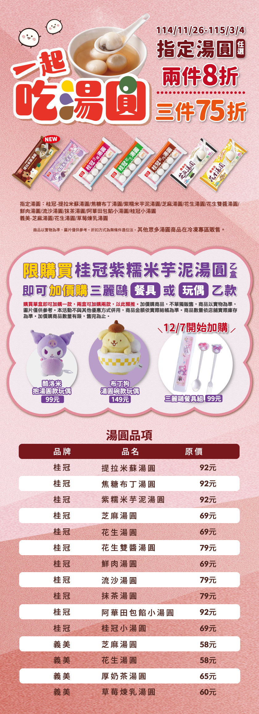 全家便利商店 11/26~3/4 指定湯圓任兩件8折,三件75折,買桂冠紫糯米芋泥湯圓可加購三麗鷗玩偶或餐具