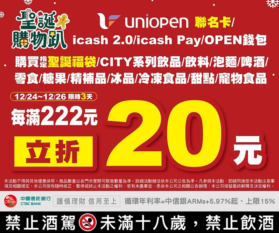 - 【便利商店】熱門主題: 7-11 聖誕購物趴 12/24~12/26 憑指定支付工具購買指定商品每滿222元折20元