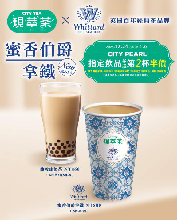 CITY TEA x Whittard 蜜香伯爵拿鐵 暖心上市!CITY PEARL指定飲品任選第2杯半價