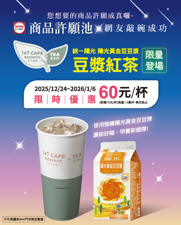 7-11 12/24~1/6 CITY TEA全品項任選第2杯半價、CITY PEARL指定飲品第2杯半價、CITY CAFE 特選美式/特選拿鐵 任選2杯99元、CITY CAFE、CITY PRIMA全品項50元加價購黑牌迷你酒50ml、統一陽光 陽光黃金豆豆漿 豆漿紅茶限時優惠60元