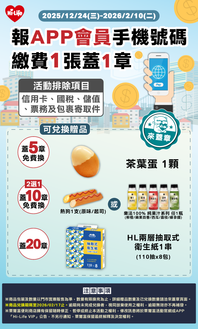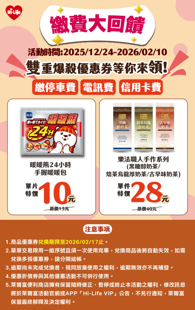 萊爾富2025/12/24~ 2026/2/10 繳費享指定商品優惠+APP會員集章免費換