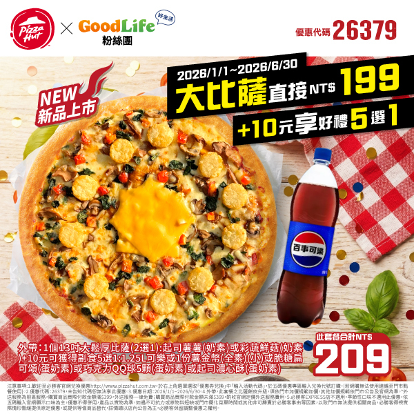 大比薩直接NT$199 +10元享好禮5選1 ,優惠代碼:26379
