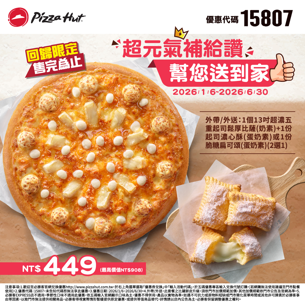必勝客 1/6~6/30 外帶/外送 1個13吋超濃五重起司鬆厚比薩(奶素) +副餐2選1 NT$449,外帶9吋 +指定副餐2選1 NT$320