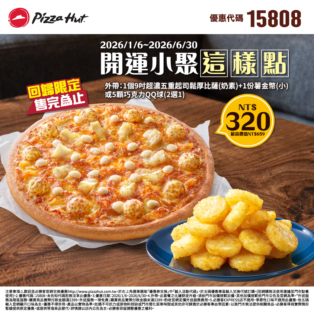 - 【餐廳美食】熱門主題: 拿坡里 雞省炸烤雙享 1/2~2/4 限時特價 必勝客比薩 1/6~6/30 新春外帶/外送 限時優惠 必勝客 1/6~6/30 外帶/外送 1個13吋超濃五重起司鬆厚比薩(奶素) +副餐2選1 NT$449,外帶9吋 +指定副餐2選1 NT$320 必勝客 贏爆新春 三個大比薩NT$588 再加碼好禮3選1 必勝客比薩 官網限定 新年優惠: 四小福雙拼比薩$199、個人比薩套餐 $111 、 副食買一送一