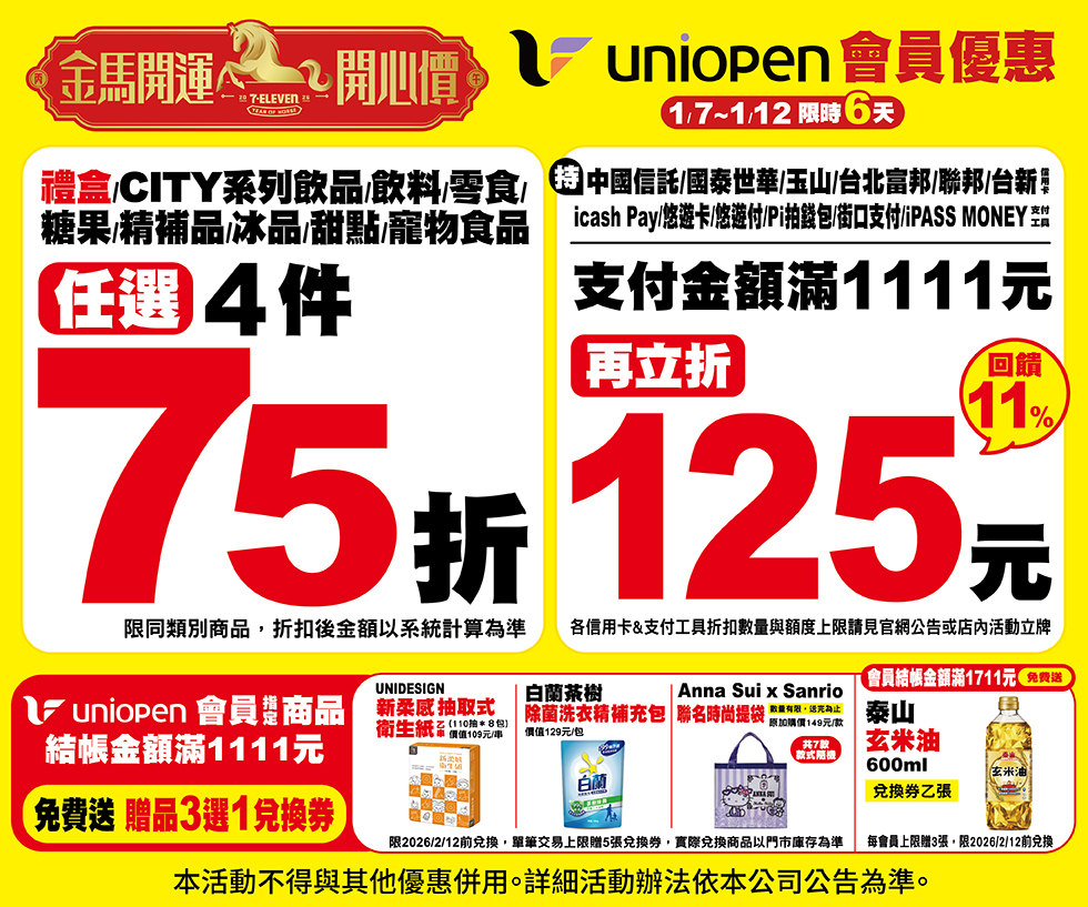 7-11 1/7~1/12 指定商品任選四件75折,指定支付工具滿額再折125元