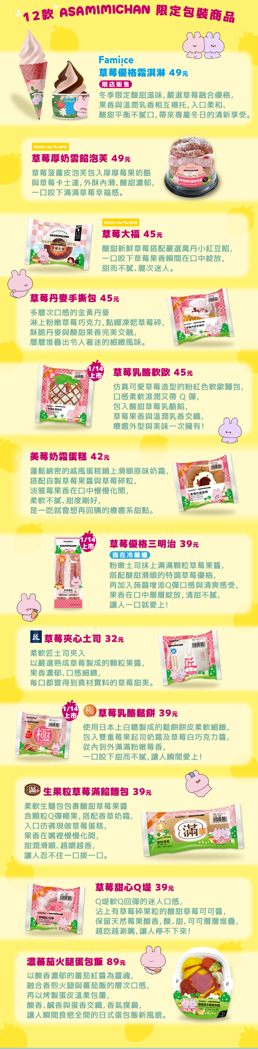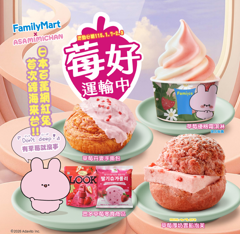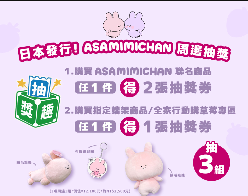 全家便利商店 草莓季 1/7~2/3 日本百萬網紅兔ASAMIMICHAN首度來臺聯名,買指定商品3件可加購杯塞吊飾