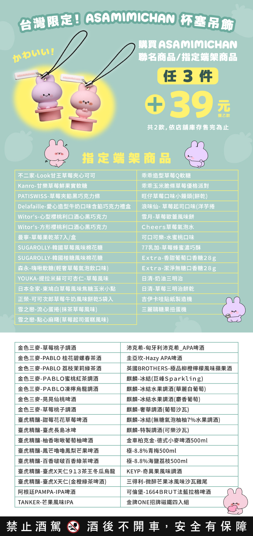 共12款聯名包裝商品,買指定商品任3件+39元可加購asamimi杯塞吊飾乙個(數量有限,售完為止)