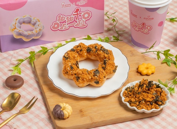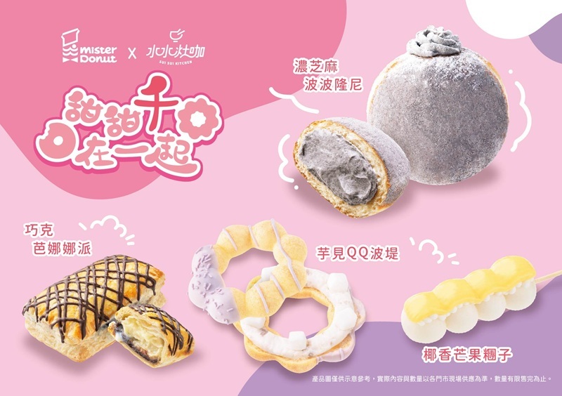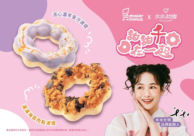 Mister Donut攜手百萬創作者『千千』的自創品牌-『水水灶咖』共同開發8款聯名商品,結合備受喜愛的台、泰特色風味元素,
