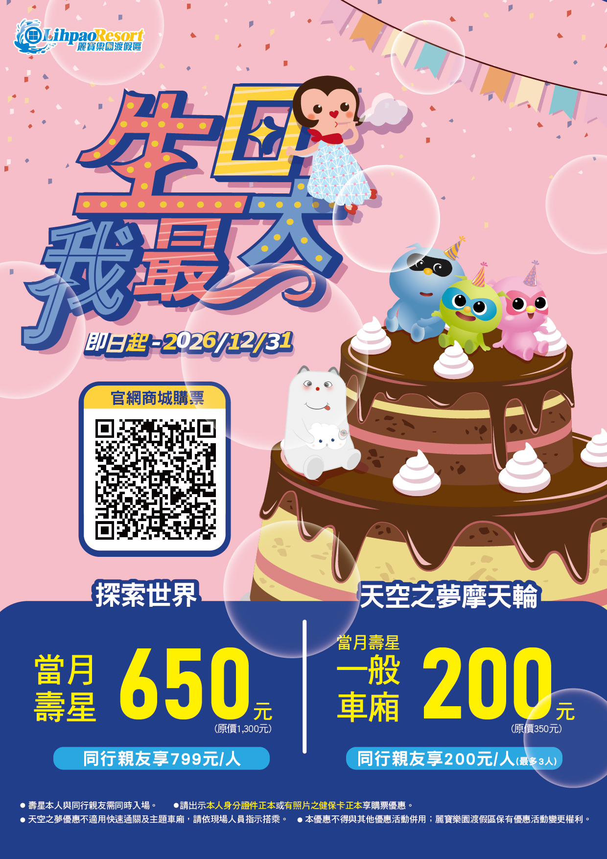 麗寶樂園2026年度當月壽星專屬優惠 探索世界/馬拉灣(水陸擇一) 本人$650元,水陸雙園區本人及同行$999元,天空之夢本人及同行$200元