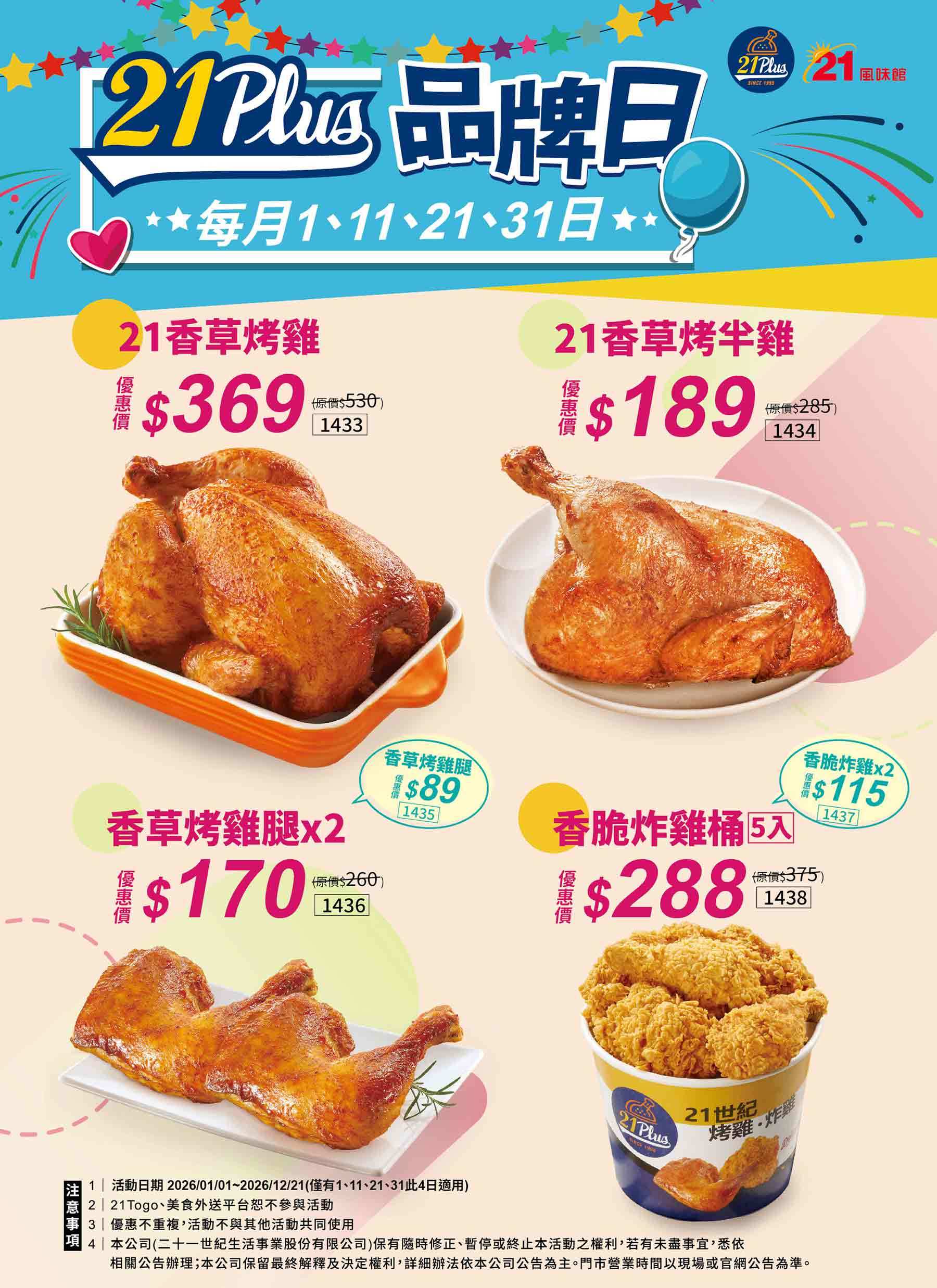 21風味館. 每月1、11、21、31日香草烤雞優惠價