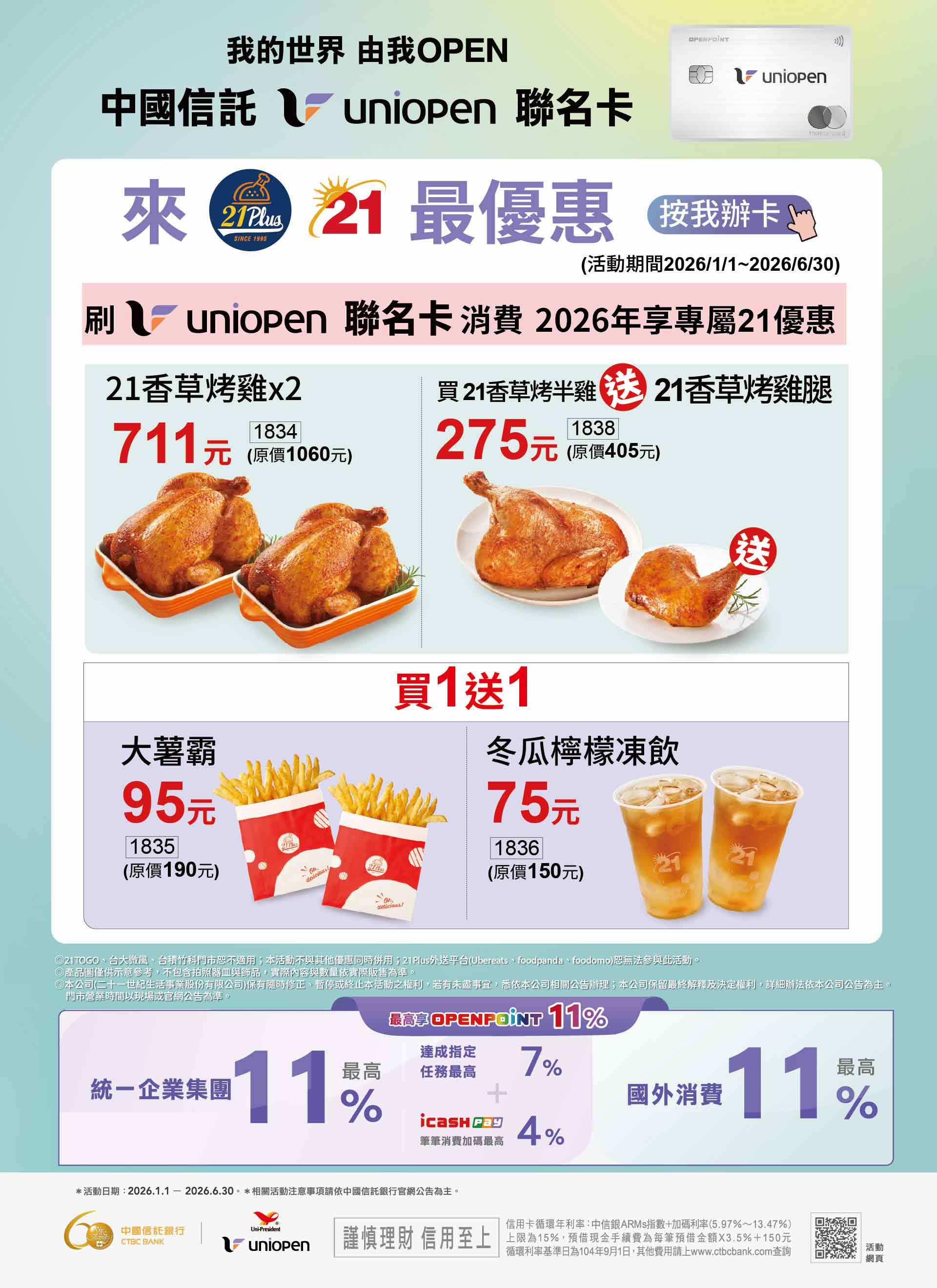 21風味館 刷 uniopen 聯名卡 享指定餐點優惠