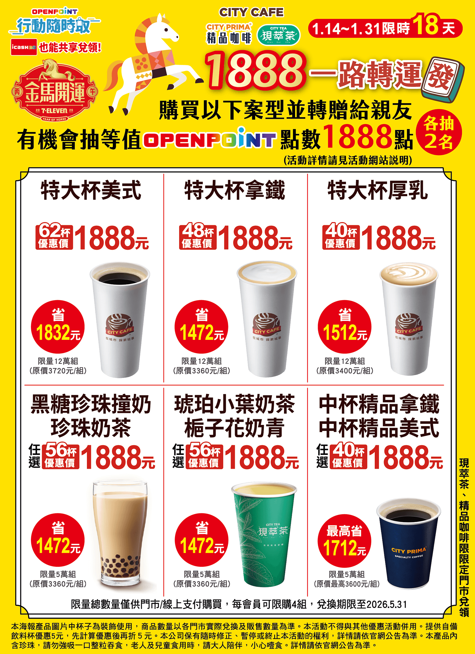 - 春節1888元指定活動 : 特大杯美式62杯1888元(抽2名)、特大杯拿鐵48杯1888元(抽2名)、特大杯厚乳40杯1888元(抽2名)、黑糖珍珠撞奶/珍珠奶茶56杯1888元(抽2名)、琥珀小葉奶茶/梔子花奶青任選56杯1888元(抽2名)、中杯精品拿鐵或美式(冰/熱)40杯1888元(抽2名),商品兌換可至2026/5/31。