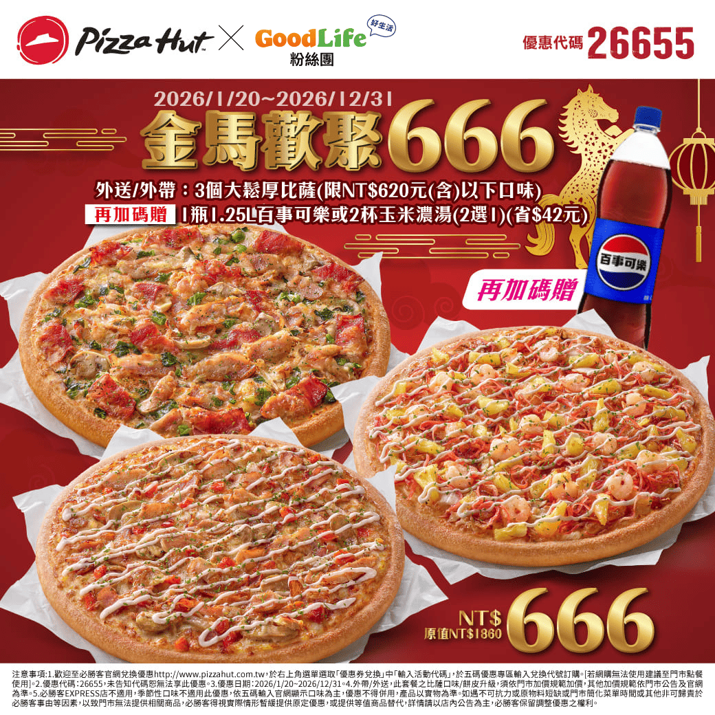 - 【餐廳美食】熱門主題: 必勝客 金馬歡聚666 1/20~12/31 3個大鬆厚比薩NT$666元 加贈 1瓶1.25L百事可樂 或 2杯玉米濃湯