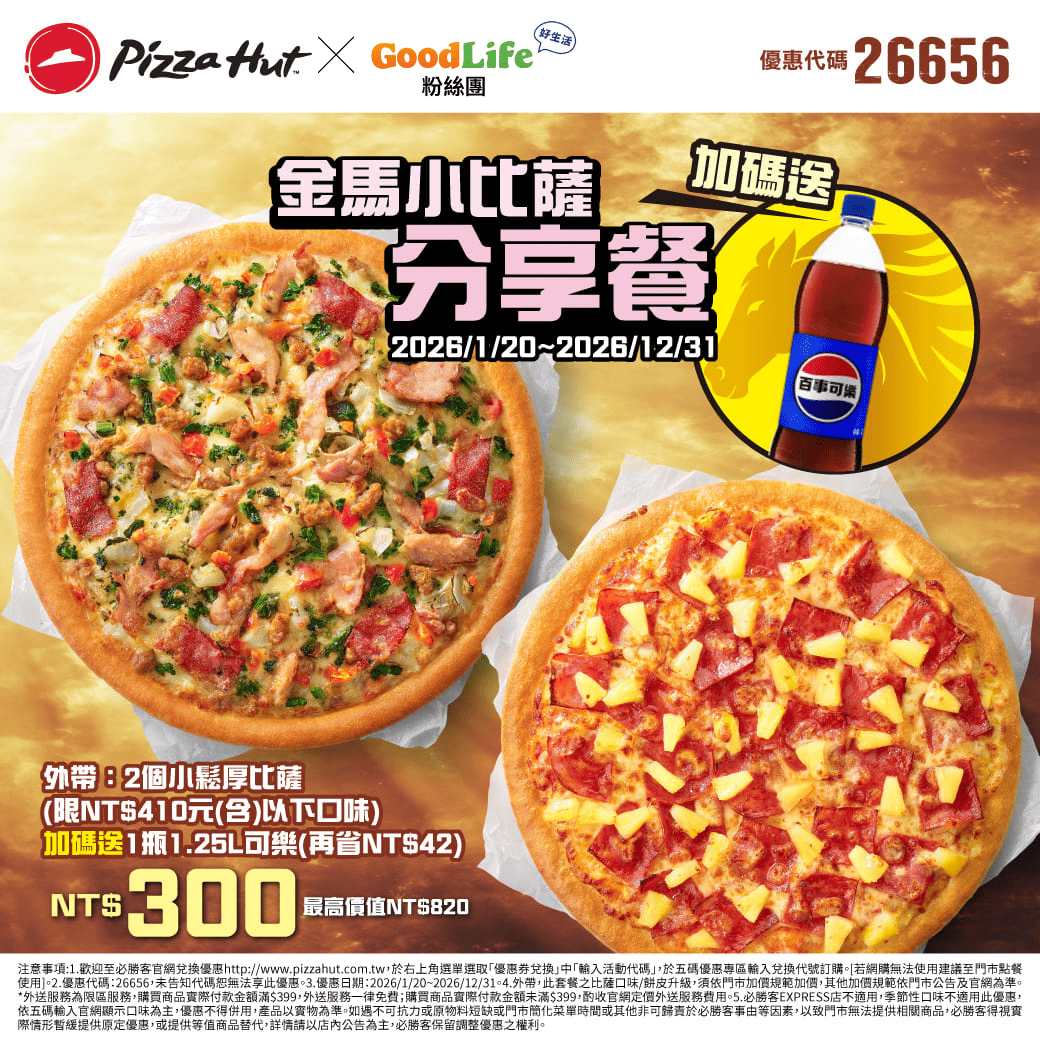 必勝客比薩 1/20~12/31 小比薩分享餐: 外帶2個小鬆厚比薩NT$300 加碼送1瓶1.25L可樂(再省NT$42)