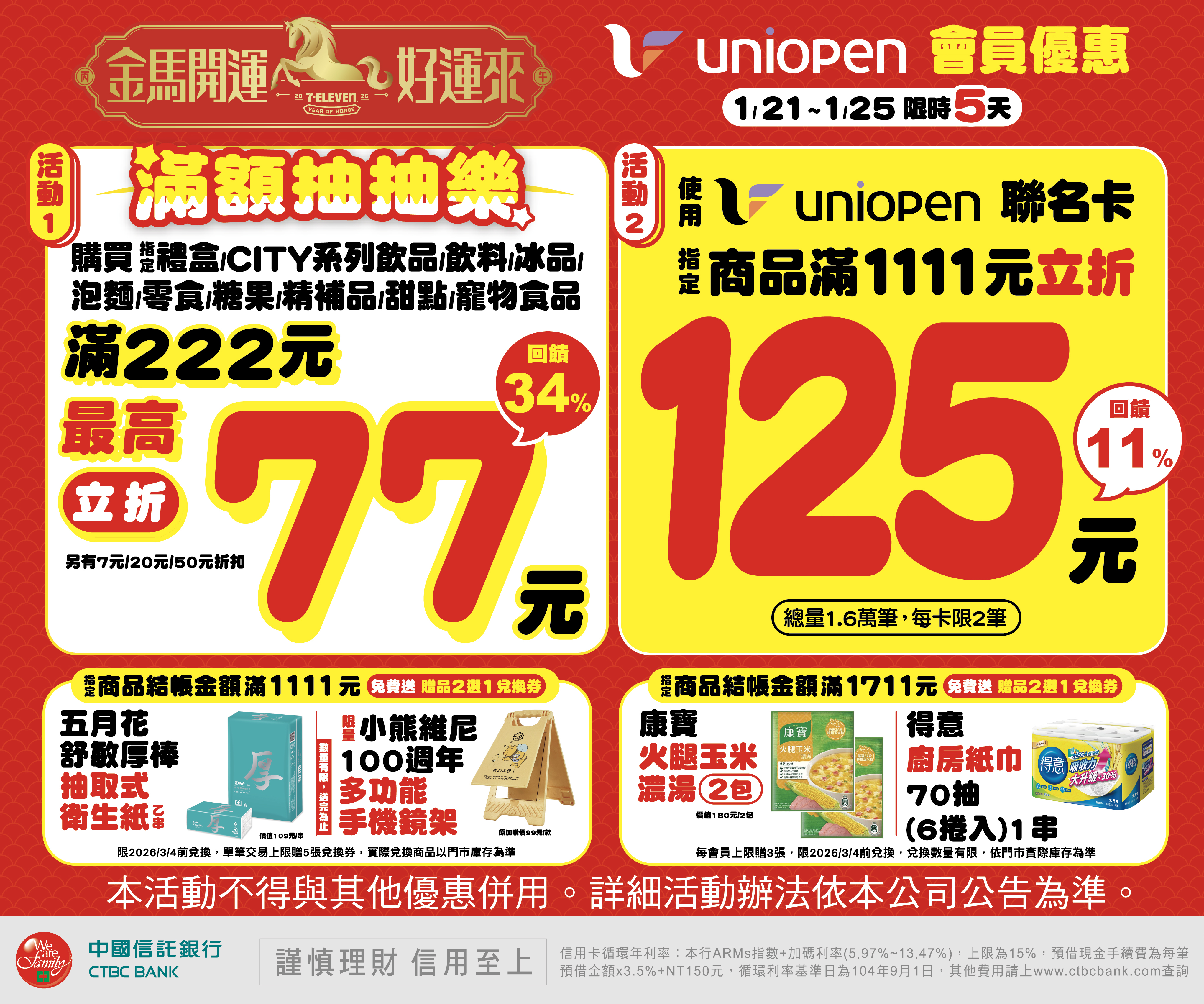 ★購買指定商品使用中國信託uniopen聯名信用卡感應支付,單筆支付金額滿1111元立折125元(限量1.6萬筆,每卡上限2次)。