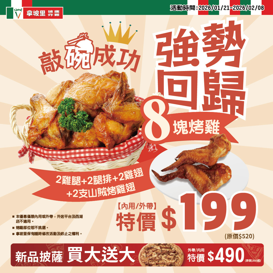 拿坡里披薩 1/21(三)~2/8(日) 內用/外帶 8塊烤雞 特價$199
