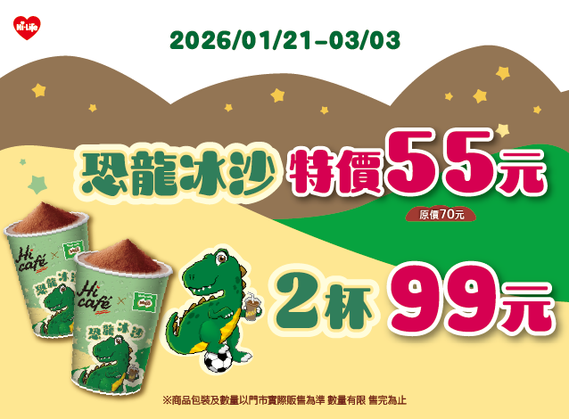 萊爾富 1/21~3/3 恐龍冰沙 特價55元 2杯99元