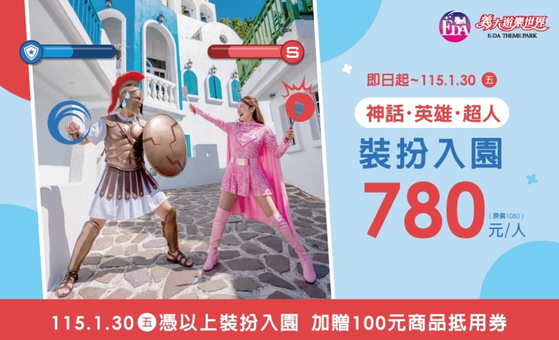 義大遊樂世界 即日起-115/1/30(五) 神話、英雄、超人裝扮 購票入園780元/人 115/1/30(五)當日裝扮入園加贈100元商品抵用券
