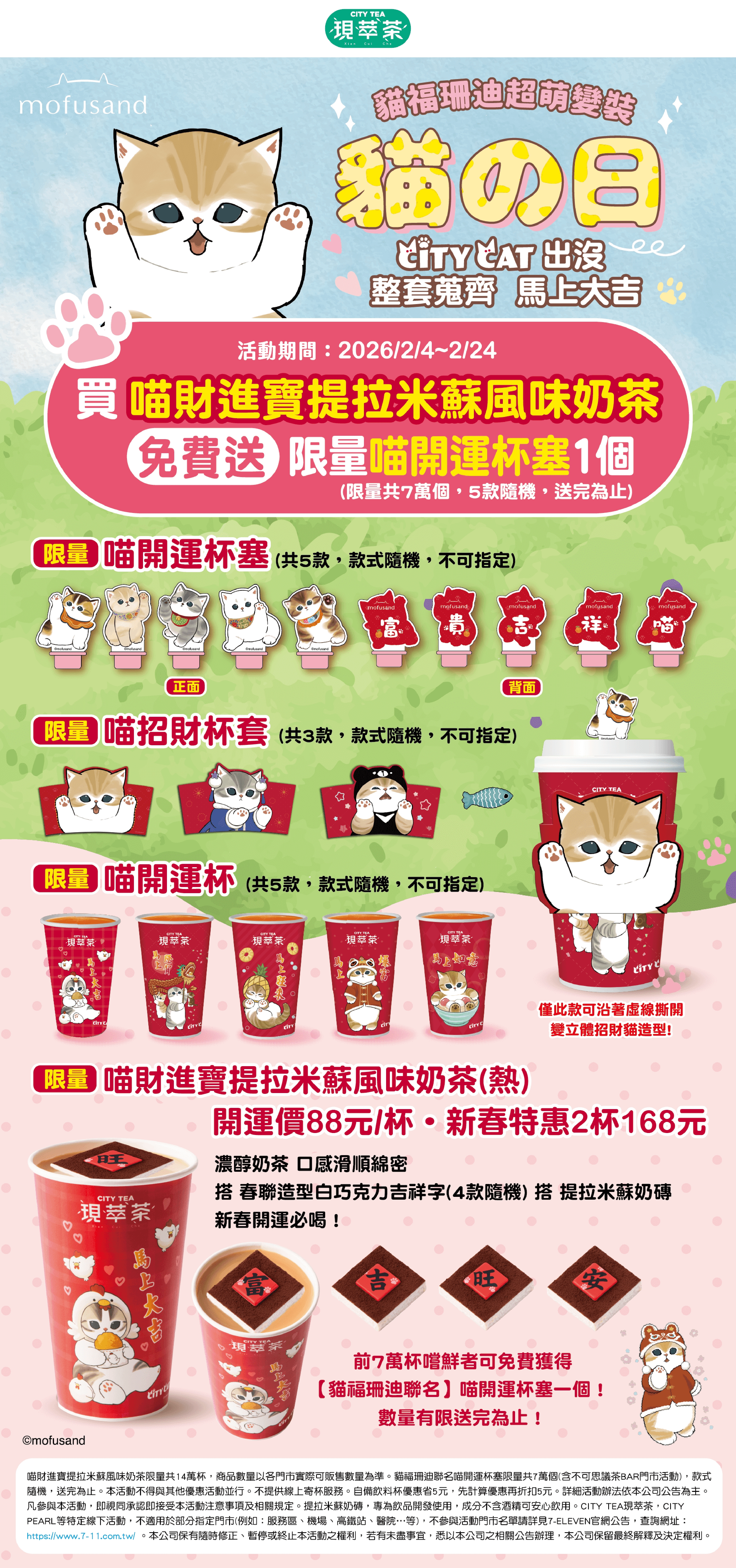 7-11 2/4~2/24 買喵財進寶提拉米蘇風味奶茶開運價88元/杯(新春特惠2杯168元)+ 免費送限量喵開運杯塞
