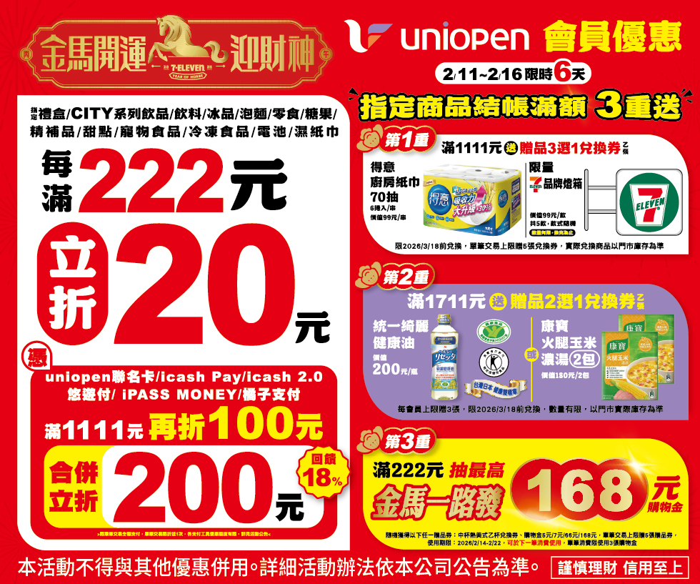 7-11 2/11~2/16 會員使用指定支付工具 購買指定商品滿1111元立折200元,回饋18%