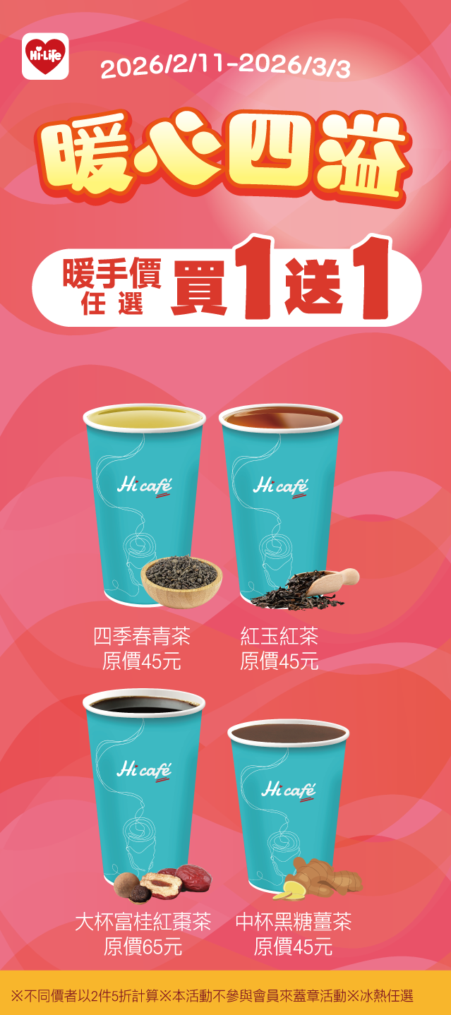 萊爾富 2/11~3/3 四季青茶、紅玉紅茶、大杯富桂紅棗茶、中杯黑糖僵茶 暖手價任選買1送1