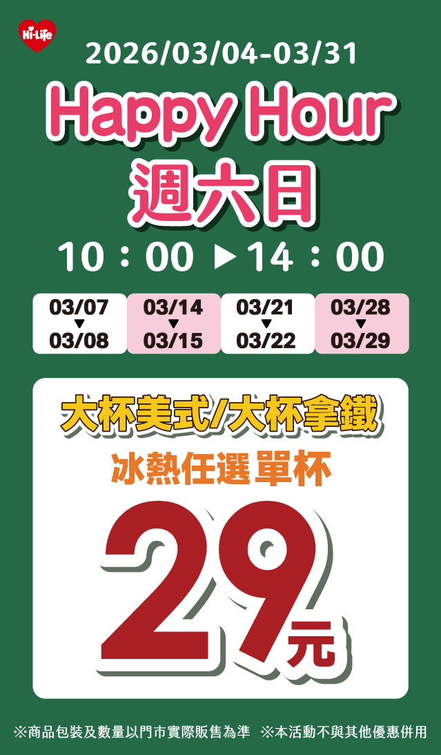 萊爾富 3/4~3/31 週六日大杯美式/拿鐵單杯29元