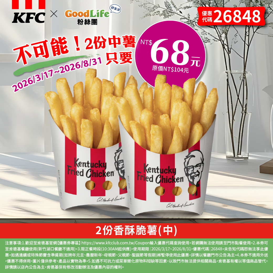 Good Life 粉絲團 不可能 !2份中薯只要NT$68 (優惠代碼:26848)