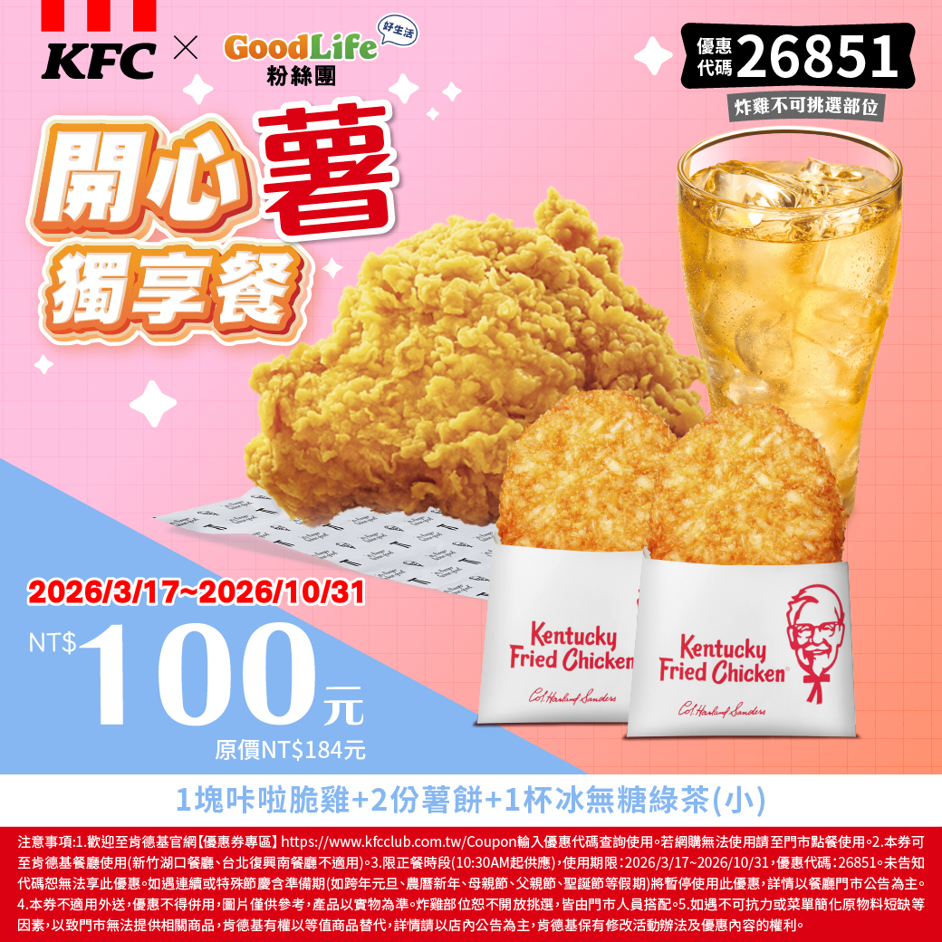 1.歡迎至肯德基官網【優惠券專區】輸入優惠代碼查詢使用。若網購無法使用請至門市點餐使用。