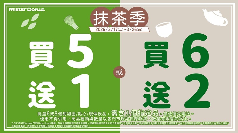 Mister Donut x 伊藤久右衛門 再獻雙茶饗宴 同時打造生系列雙茶爆餡波波隆尼,再加碼 甜甜圈買六送二優惠