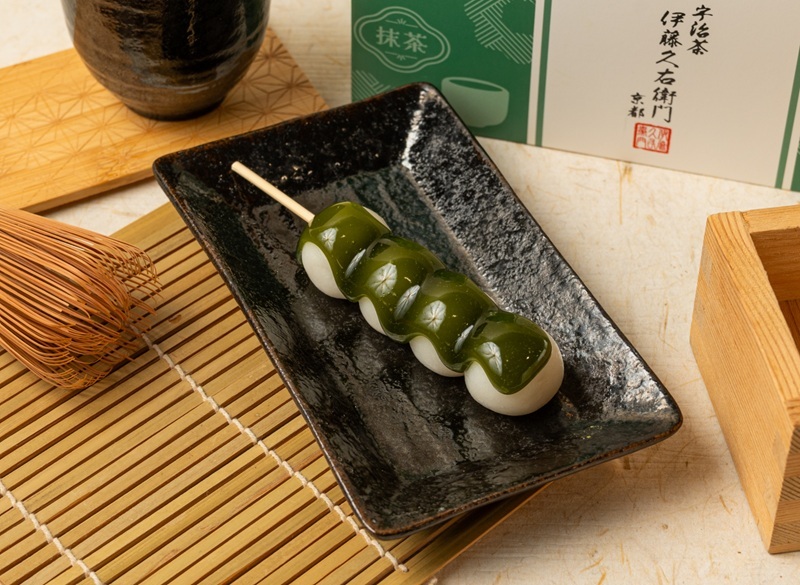 將經典日式糰子擠上以伊藤久右衛門抹茶粉特調的抹茶糖蜜,
