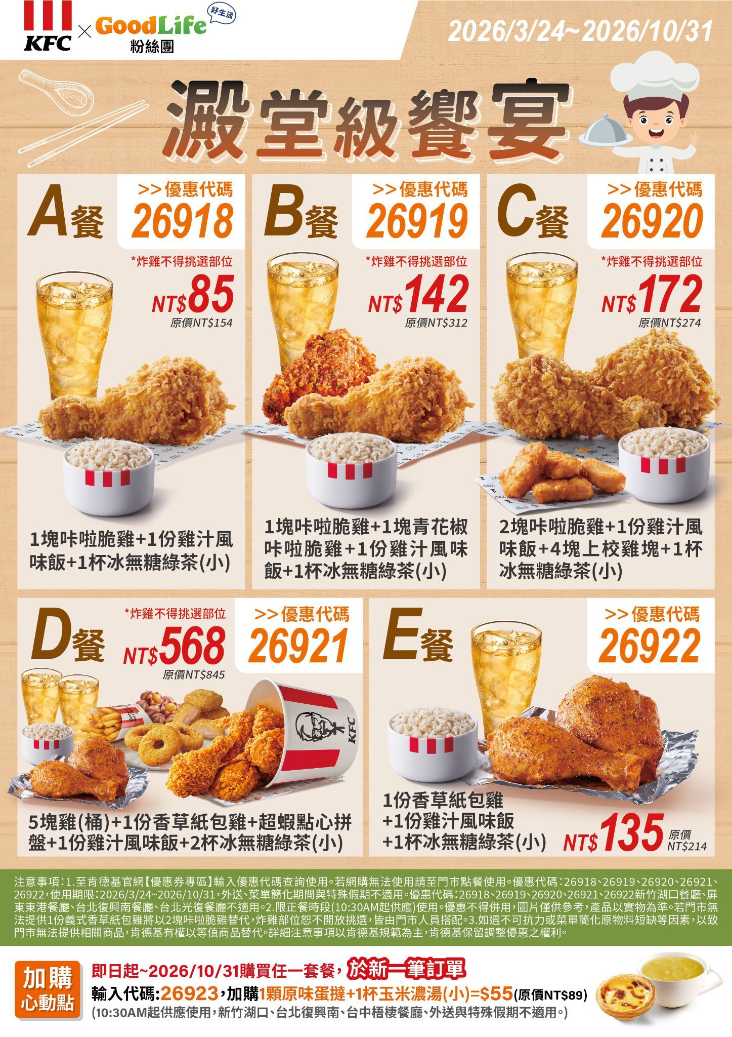 加購心動點 (優惠代碼:26923) 購買任一套餐, 加購1顆原味蛋撻+1杯玉米濃湯(小)=NT$55