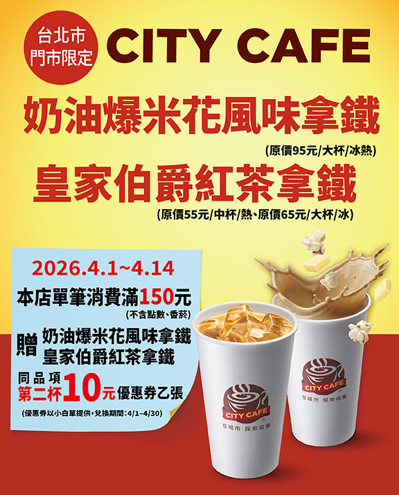 台北市門市限定!指定門市全店單筆消費滿150元(不含點數、香菸)贈奶油爆米花風味拿鐵、皇家伯爵紅茶拿鐵同品項第二杯10元優惠券乙張(優惠券以小白單提供,兌換期間:4/1–4/30)