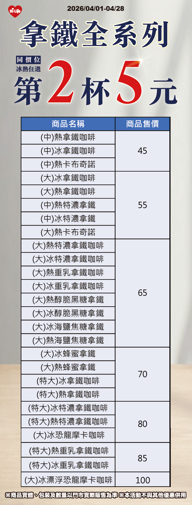 拿鐵全系列 同價位 第2杯5元
