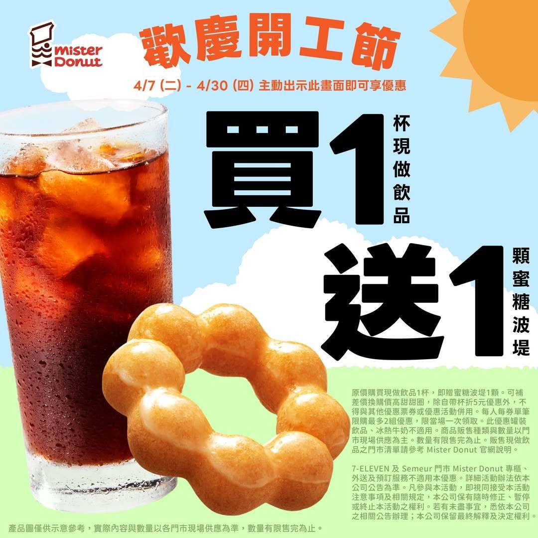 MisterDonut 4/7(二)~4/30(四) 原價購買任一現做飲品送蜜糖波堤