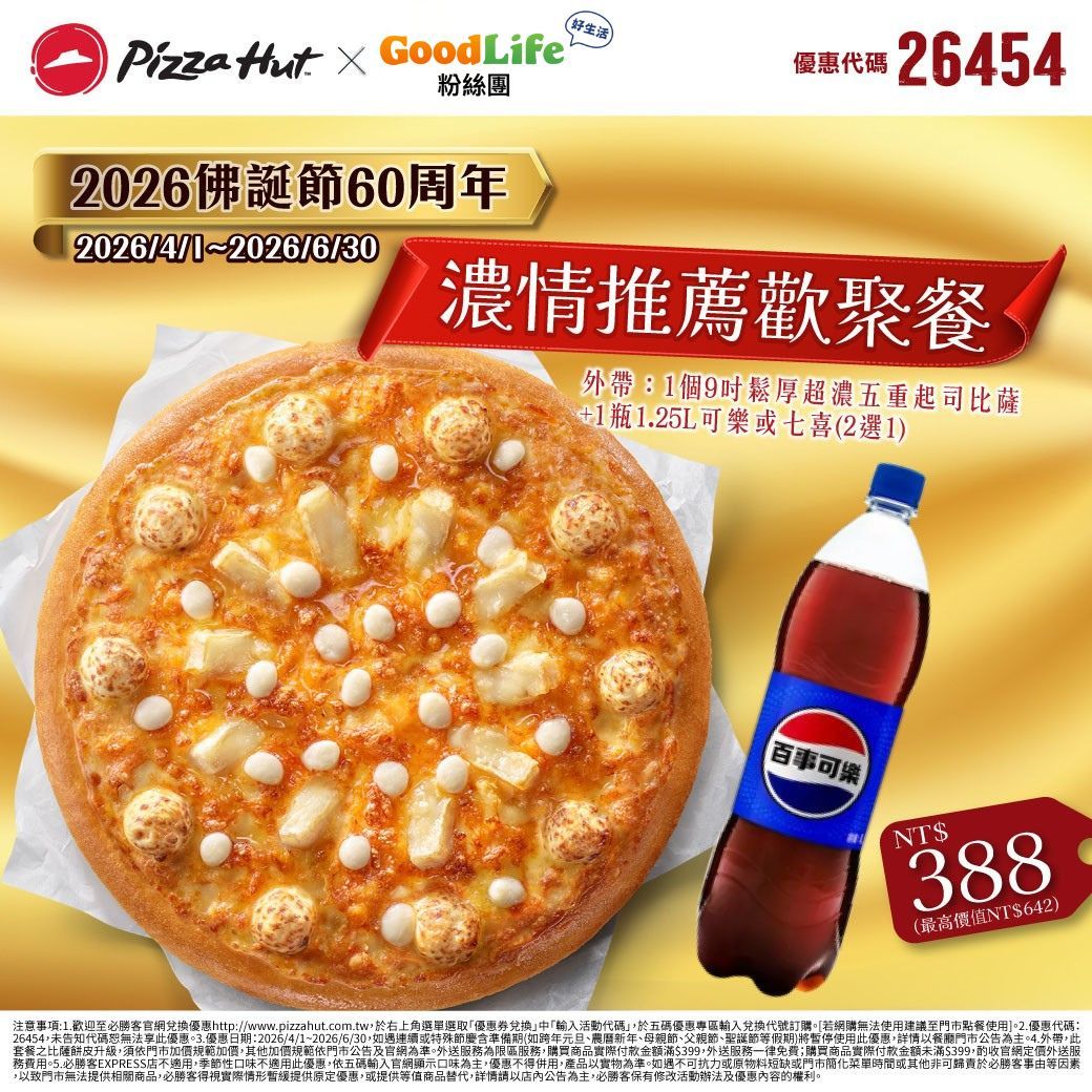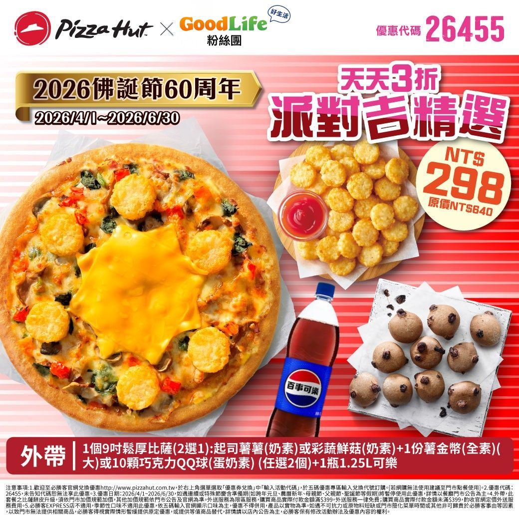 必勝客比薩 4/1~6/30 2026佛誕節60周年素食比薩優惠券