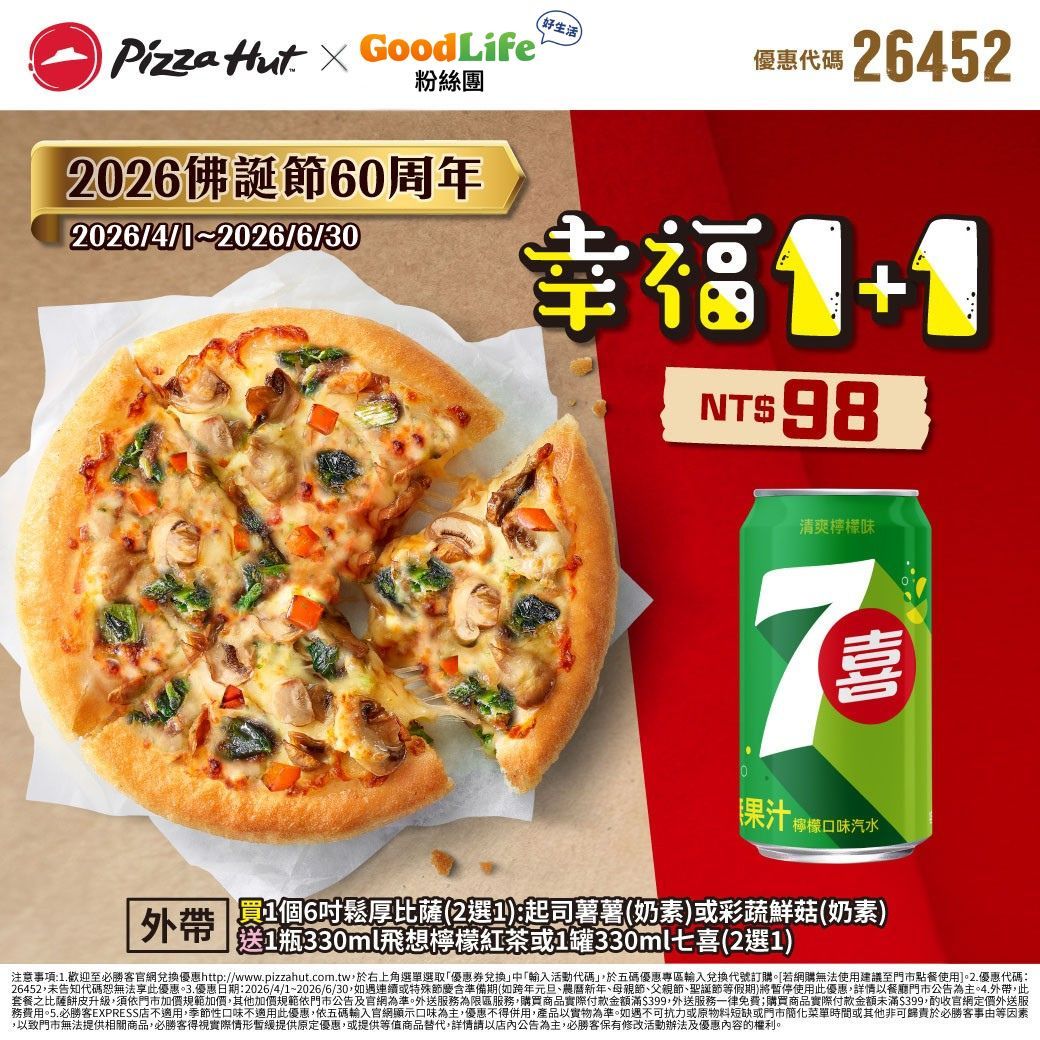 外帶 買1個6吋鬆厚比薩(2選1):起司薯薯(奶素)或彩蔬鮮菇(奶素)=NT$98 送1瓶330ml飛想檸檬紅茶或1罐330ml七喜(2選1)