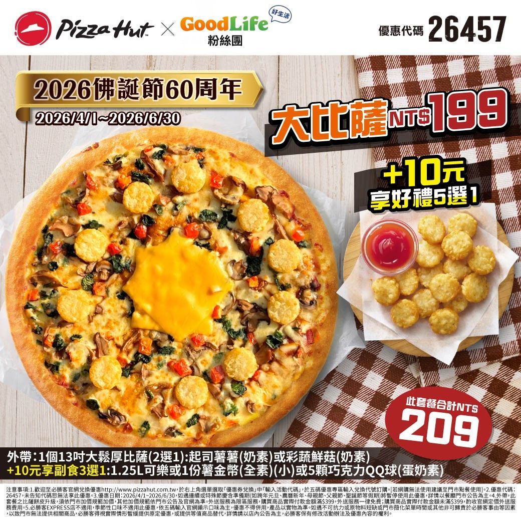 2026佛誕節 60周年 大比薩NT$199 +10元享好禮5選1 (優惠代碼:26457)