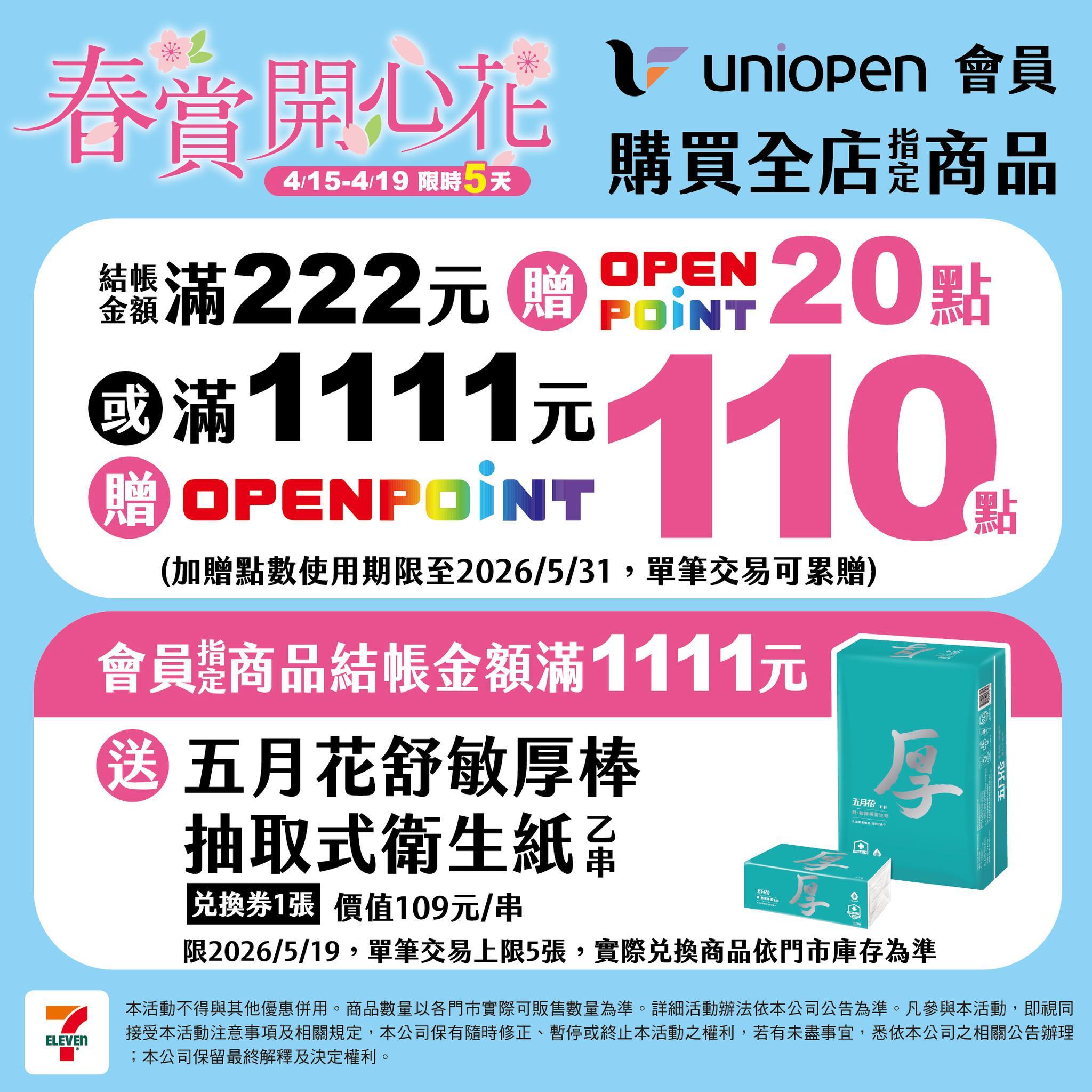 uniopen 會員購買全店指定商品結帳金額每滿222元贈20點OPENPOINT 或滿1111元贈110點OPENPOINT