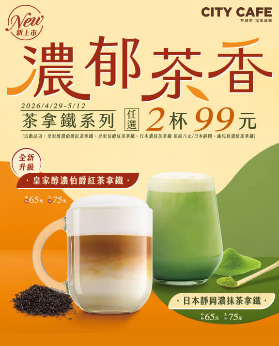 CITY CAFE 皇家醇濃伯爵紅茶拿鐵 全新升級、日本靜岡農抹茶拿鐵 新上市!茶拿鐵系列任選2杯99元