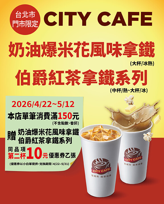 台北市門市限定!指定門市全店單筆消費滿150元(不含點數、香菸)贈奶油爆米花風味拿鐵、伯爵紅茶拿鐵系列同品項第二杯10元優惠券乙張(優惠券以小白單提供,兌換期間:4/22–5/31)